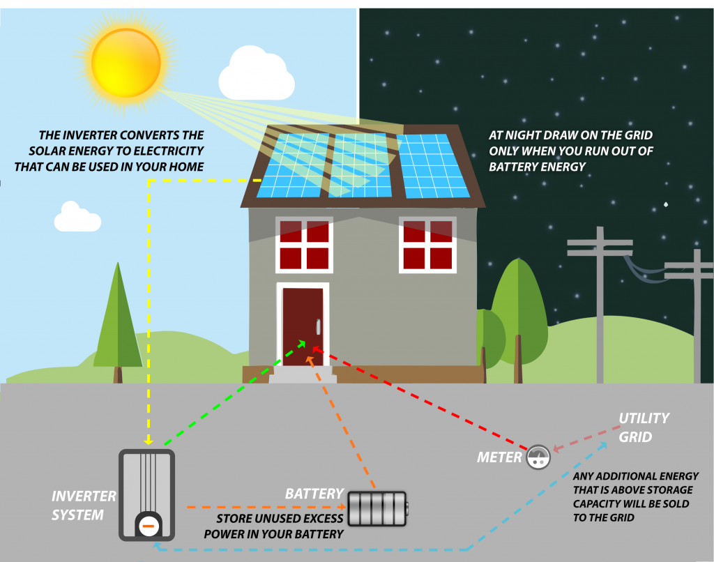 At night, the battery power home through the inverter, the unspent power in the battery could be sold to the grid