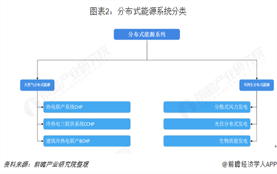 在我國分布式能源系統(tǒng)結(jié)構(gòu)中,主要由兩部分組成,分別是天然氣分布式能源以及可再生分布式能源,其中天然氣分布式能源根據(jù)聯(lián)產(chǎn)系統(tǒng)的不同可以分為熱電聯(lián)產(chǎn)系統(tǒng)CHP、冷熱電三聯(lián)供系統(tǒng)CCHP和建筑冷熱電聯(lián)產(chǎn)BCHP;可再生分布式能源根據(jù)供能主體的不同可以分為分散式風(fēng)力發(fā)電、光伏分布式發(fā)電和生物質(zhì)能發(fā)電等。