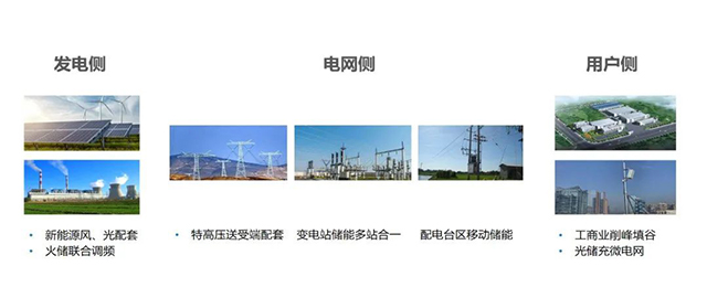 圍繞電力系統(tǒng)的“發(fā)、輸、變、配、用”五大環(huán)節(jié),儲能的應(yīng)用場景主要分為發(fā)電側(cè)、電網(wǎng)側(cè)、用戶側(cè)。在發(fā)電側(cè),主要是聯(lián)合傳統(tǒng)火電機組參與AGC輔助服務(wù)、與新能源風(fēng)光配套平抑波動提高風(fēng)光利用率;在電網(wǎng)側(cè),主要是與特高壓送受端配套緊急功率支撐、變電站儲能調(diào)峰調(diào)頻、配電臺區(qū)儲能緩解重過載;在用戶側(cè),主要是工商業(yè)用戶削峰填谷、光儲充微電網(wǎng)。