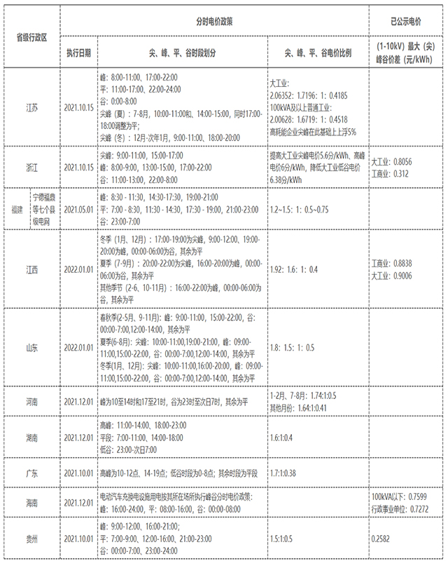 表1 已公開分時電價政策的省份
