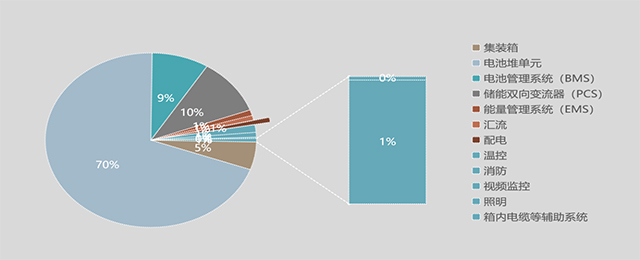 由于項目規(guī)模及電壓等級一般較小,目前用戶側(cè)儲能系統(tǒng)主要采用All in one的方案,即將電池堆單元、電池管理系統(tǒng)(BMS)、儲能雙向變流器(PCS)、能量管理系統(tǒng)(EMS)、匯流、配電、溫控、消防、視頻監(jiān)控、照明等輔助系統(tǒng)集成在單個集裝箱內(nèi),根據(jù)情況選擇接入點是否新增開關(guān)柜。下面以典型1MW/2MWh,400V接入,室外集裝箱布置的儲能項目為例,儲能系統(tǒng)造價構(gòu)成比例如下所示: